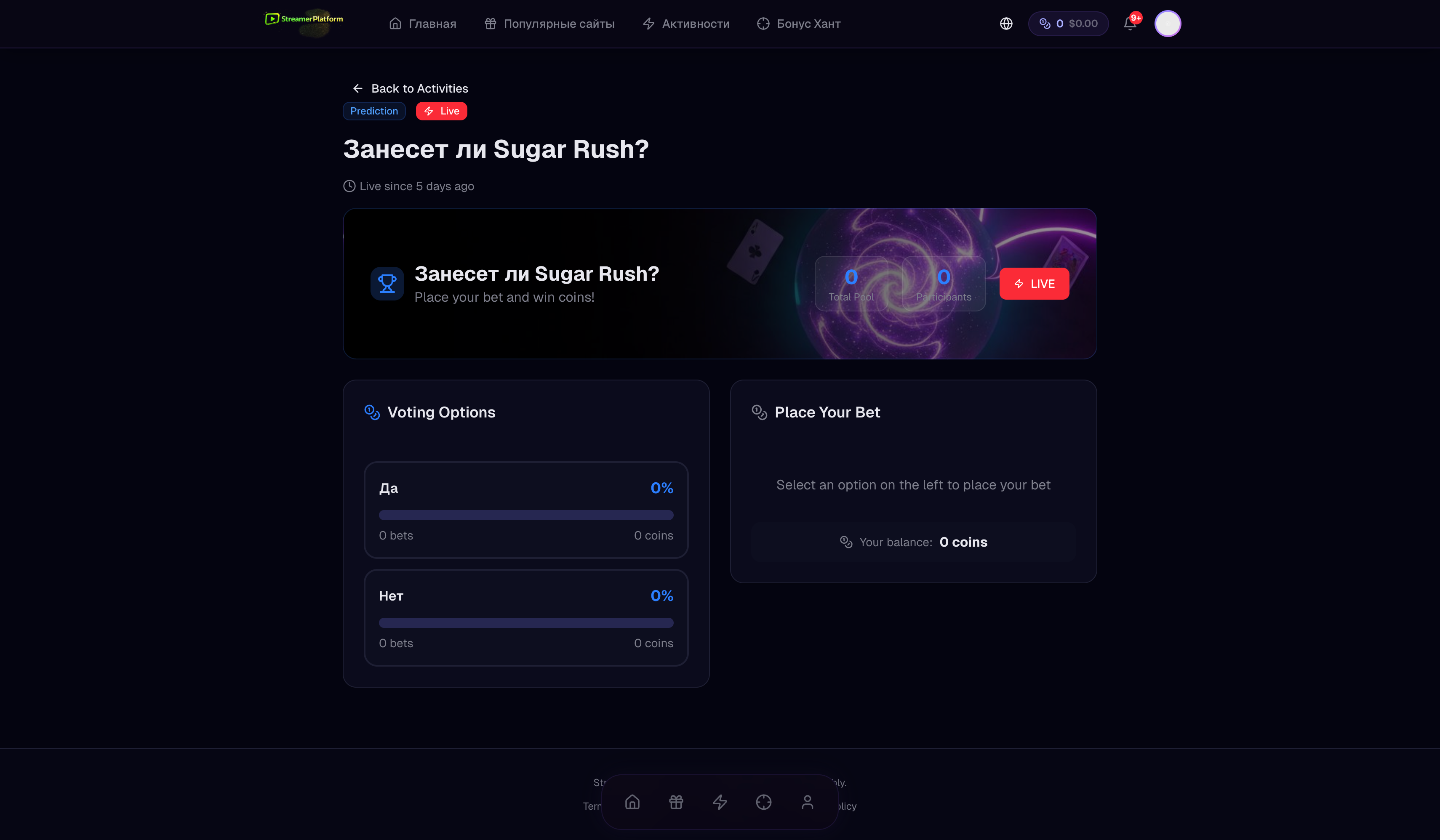 Зрители ставят внутреннюю валюту на исход события: да или нет. После результата монеты распределяются между угадавшими.