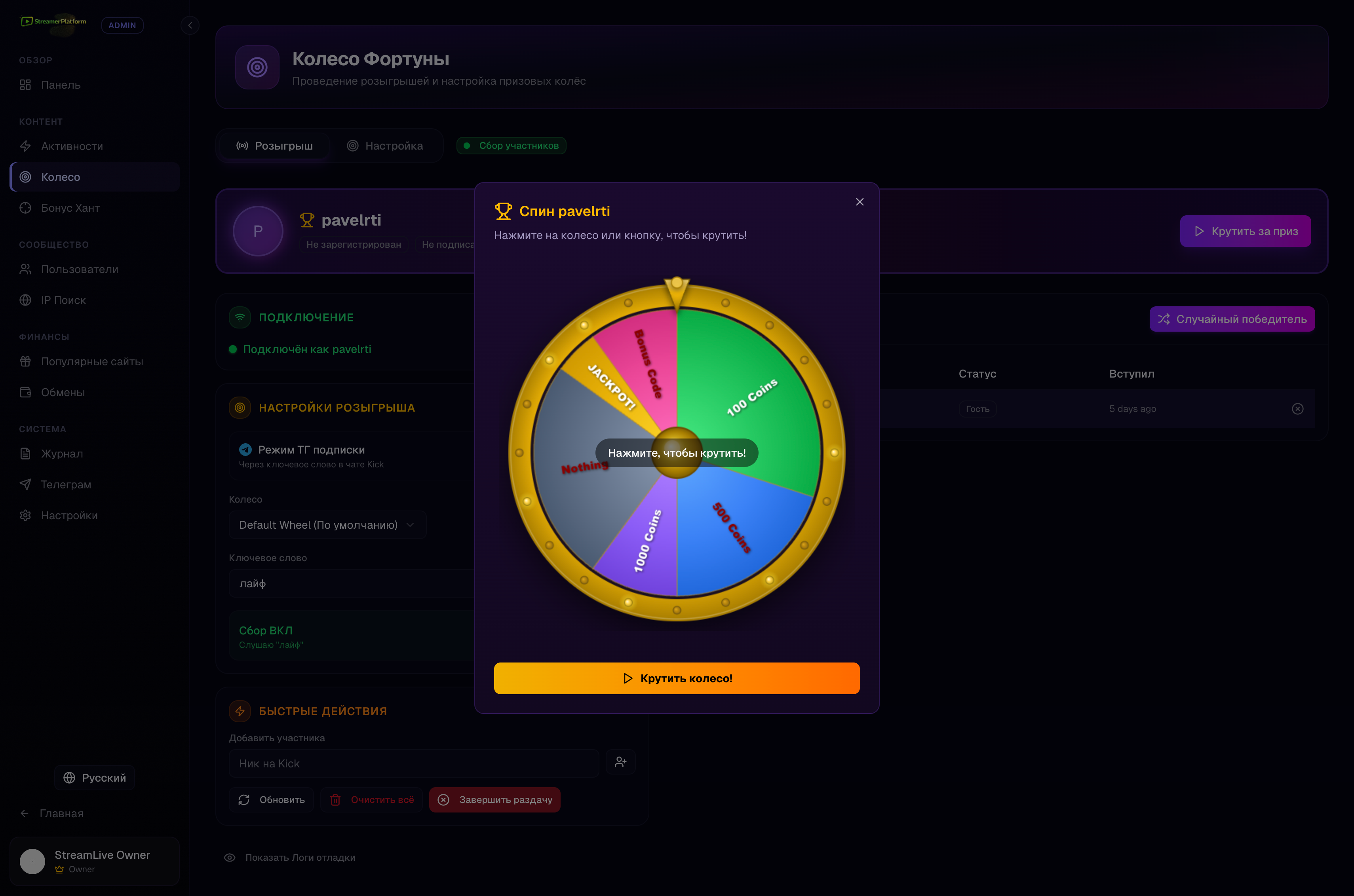 Создавайте колесо с призами, собирайте участников прямо из чата Kick и крутите в прямом эфире.