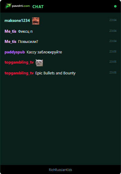 Stream chat overlay with custom badges from your site, emote support, and real-time connection. Works with Kick and Twitch.