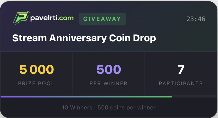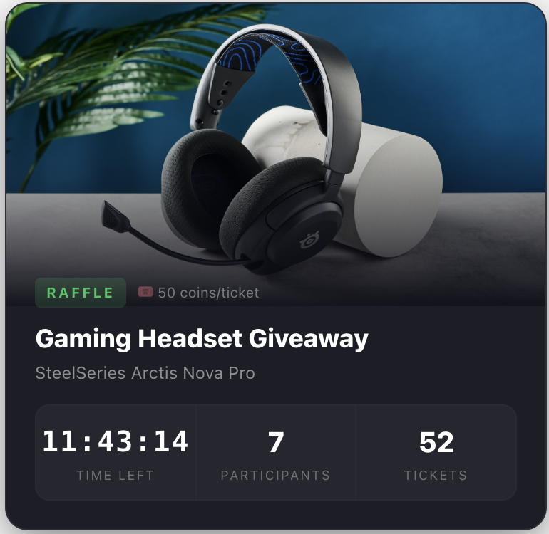 Instant in-game currency giveaways. Set the number of winners and total pool — the system randomly selects participants.