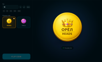 x1.96Heads or tails — viewers choose a side and place their bet. 3D flip animation with custom coin designs. Provably Fair based on SHA-256.