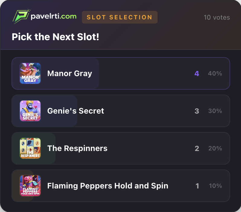 Viewers vote for the next slot for the streamer. Displayed in real time with vote and coin counts.
