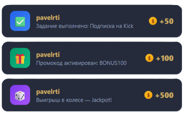 The quest system is a powerful tool for growing your audience and monetizing through partner programs. Create tasks of any type — from subscribing to your Kick, Twitch, or YouTube channel and Telegram group to registering on partner platforms. Each task has a configurable coin reward that motivates viewers to take action. Automatic verification works for Kick (via webhooks), Twitch, YouTube, and Telegram (via API) — viewers complete the task and receive coins instantly. For custom tasks and partner registrations, a manual review mode is available: the viewer submits their username or login, and the admin approves or rejects the submission in a dedicated panel. All tasks support custom icons, colored badges, and descriptions. You can mark tasks as repeatable so viewers can earn coins from them regularly. The admin panel shows full statistics: how many users completed each task, how many are awaiting review, and the total coins distributed. This is the ideal tool for driving social media growth, building a loyal community, and integrating partner offers directly into your platform.