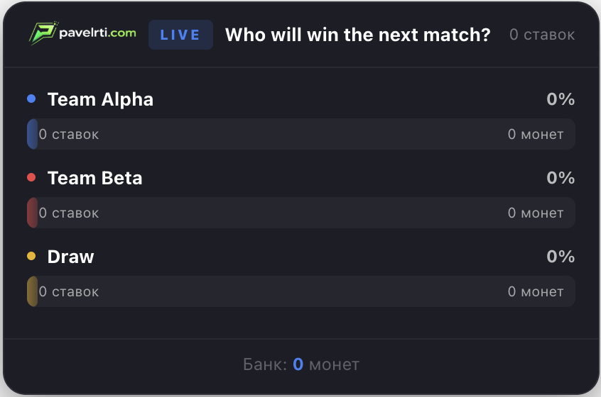Viewers bet in-game currency on the outcome of an event: yes or no. After the result, coins are distributed among those who guessed correctly.